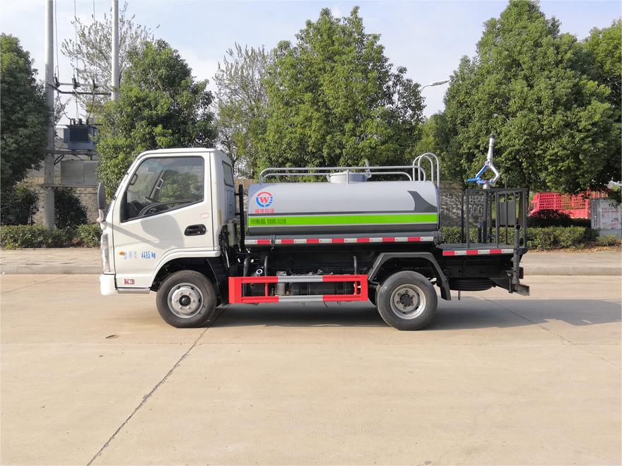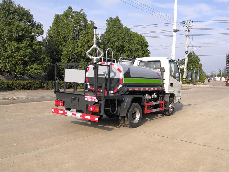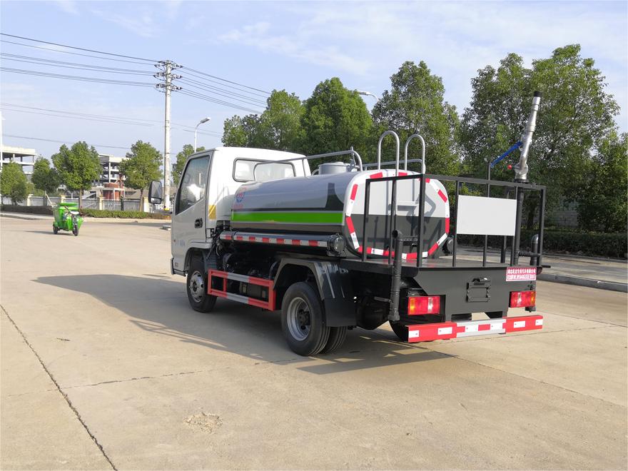 灑水車前裝有鴨形噴嘴或圓頭沖嘴,后面裝有圓柱開灑水噴嘴或蓮蓬頭噴嘴,后部有一工作平臺(tái),裝配有水炮。后部還可裝8個(gè)噴嘴(選裝)。