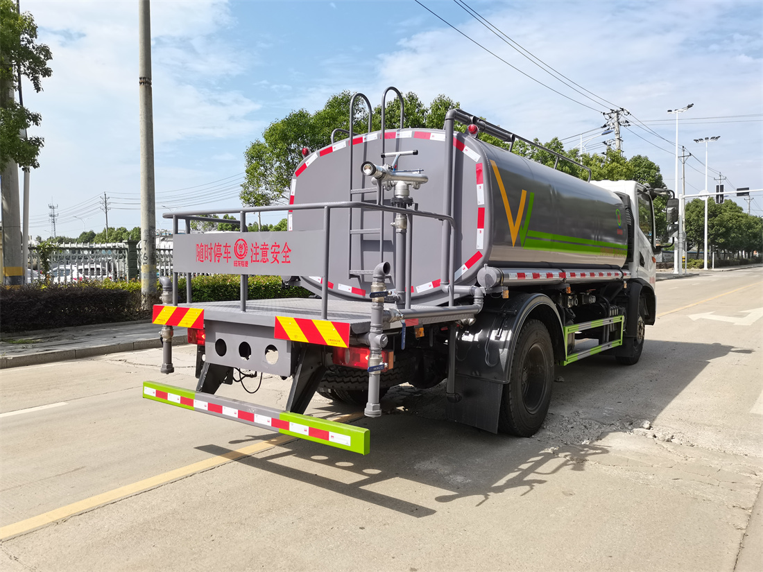 灑水車前裝有鴨形噴嘴或圓頭沖嘴,后面裝有圓柱開灑水噴嘴或蓮蓬頭噴嘴,后部有一工作平臺(tái),裝配有水炮。后部還可裝8個(gè)噴嘴(選裝)。