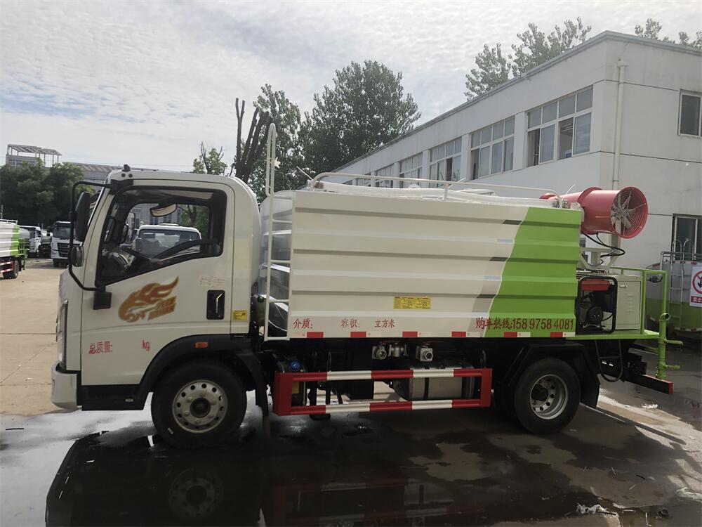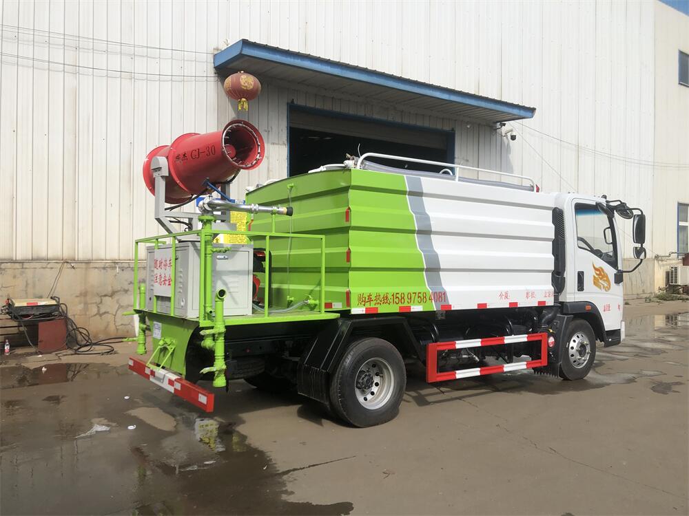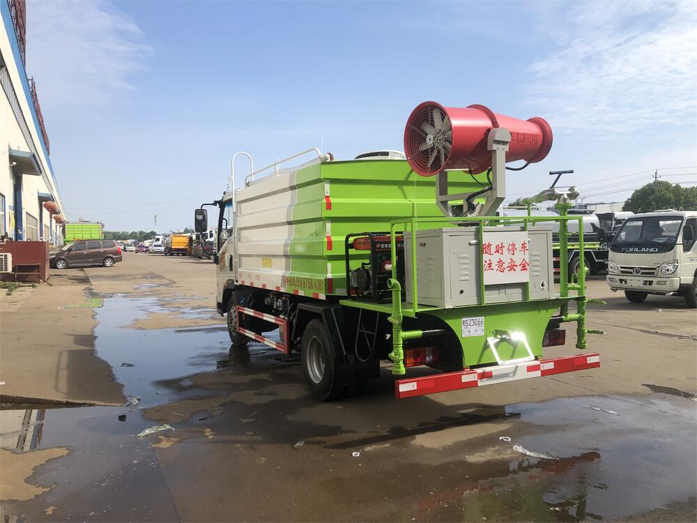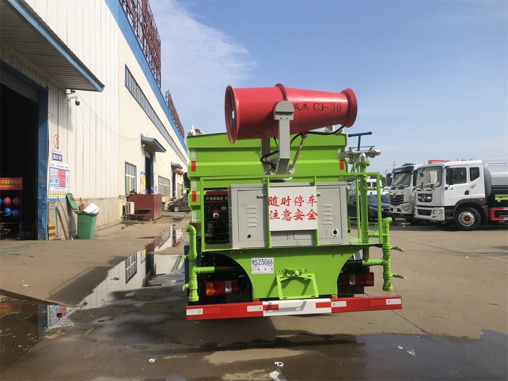 上裝配置:罐體容積為 5-7立方,選配風送式霧炮機組射程30米、40米、50米、60米、80米、100米、120米霧炮,罐體鋼板為4mm碳鋼Q235材質,罐內隔板具有防波作用,以減輕汽車行駛時罐體液體沖擊,罐體及整車外形尺寸按照公告。帶大功率專用灑水泵,泵可自吸自排,整車前沖、后灑、側噴、帶65消防接口,后平臺配CLW-50、CLW-60、CLW-80、CLW-100、CLW-120型風送式霧炮機組;罐體前封頭配大功率柴油發電機組;前封頭帶水位計,后平臺主管路帶1寸澆花接口,后爬梯。帶兩根輸水管及陰陽端。罐體顏色:銀/灰/綠,罐體兩側噴“多功能抑塵車”字樣,貼反光標示。