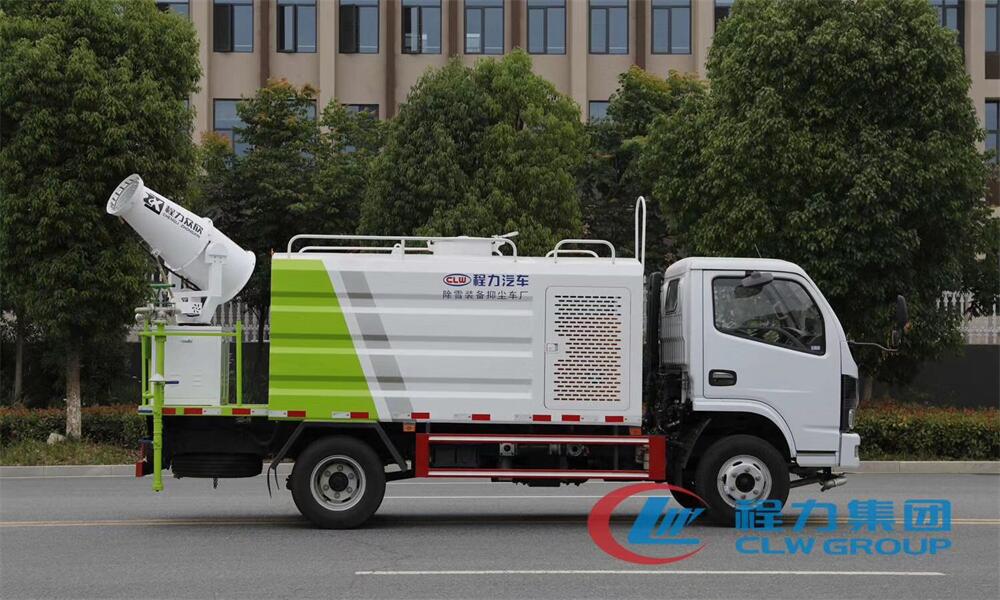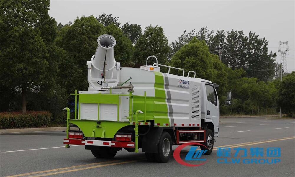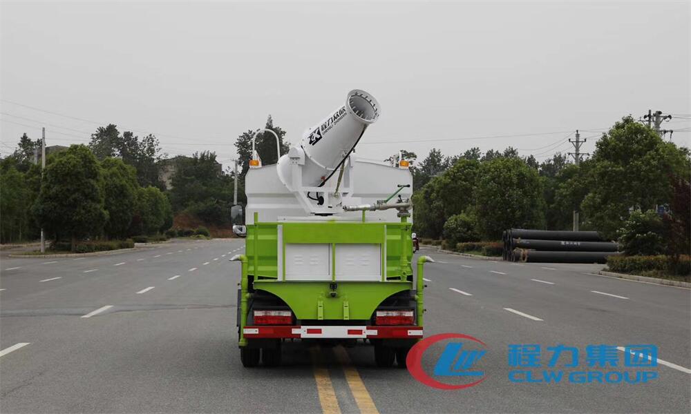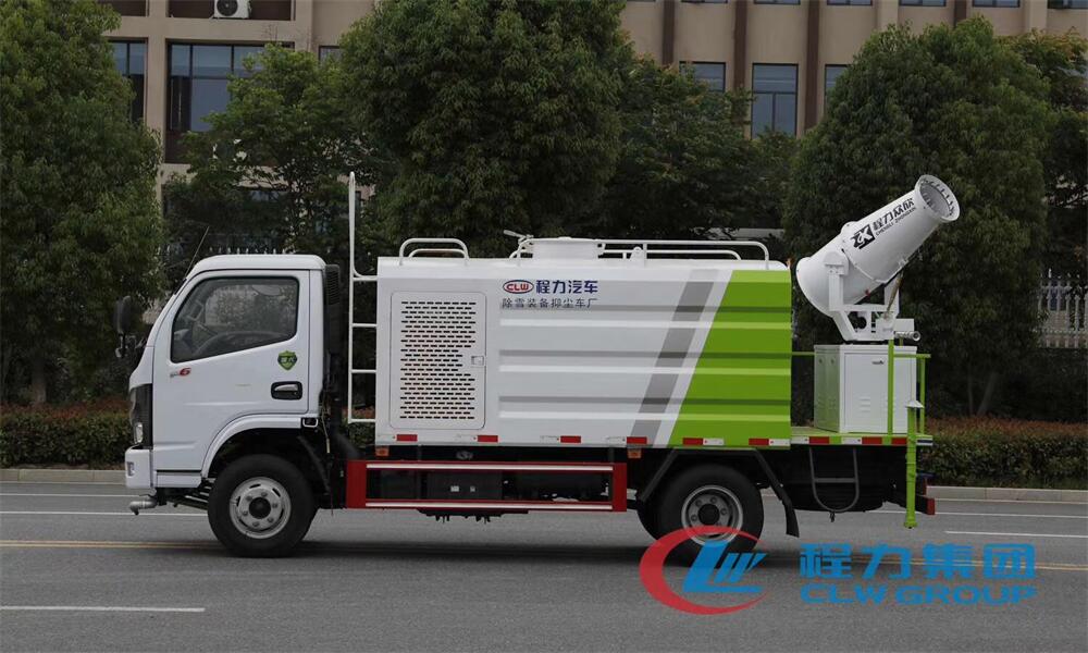 上裝配置:罐體容積為 5-7立方,選配風送式霧炮機組射程30米、40米、50米、60米、80米、100米、120米霧炮,罐體鋼板為4mm碳鋼Q235材質,罐內隔板具有防波作用,以減輕汽車行駛時罐體液體沖擊,罐體及整車外形尺寸按照公告。帶大功率專用灑水泵,泵可自吸自排,整車前沖、后灑、側噴、帶65消防接口,后平臺配CLW-50、CLW-60、CLW-80、CLW-100、CLW-120型風送式霧炮機組;罐體前封頭配大功率柴油發電機組;前封頭帶水位計,后平臺主管路帶1寸澆花接口,后爬梯。帶兩根輸水管及陰陽端。罐體顏色:銀/灰/綠,罐體兩側噴“多功能抑塵車”字樣,貼反光標示。