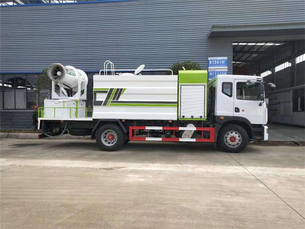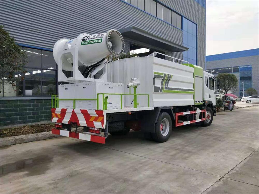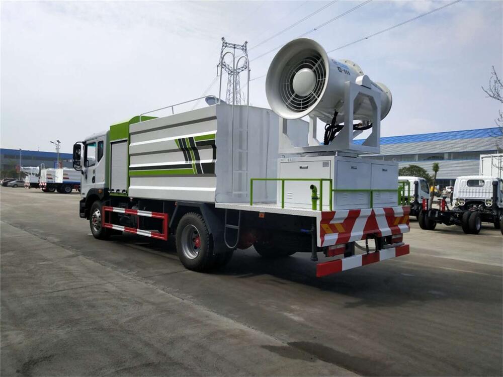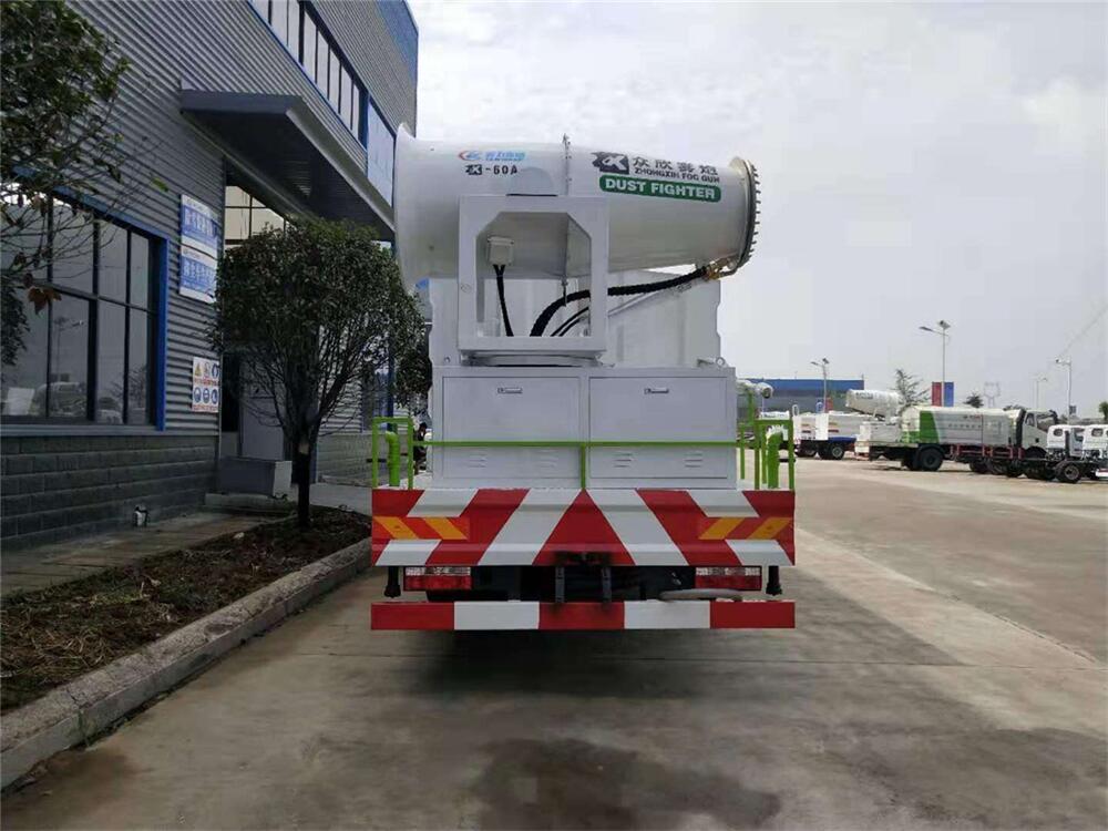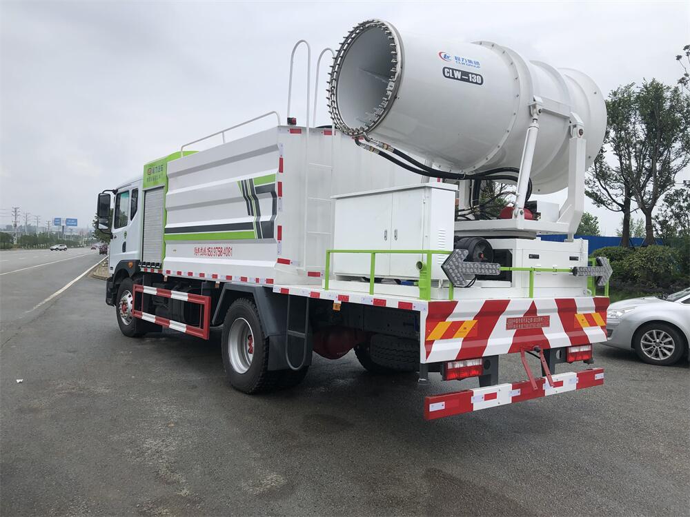 上裝配置:罐體容積為 12立方,選配風送式霧炮機組射程30米、40米、50米、60米、80米、100米、120米霧炮,罐體鋼板為4mm碳鋼Q235材質,罐內隔板具有防波作用,以減輕汽車行駛時罐體液體沖擊,罐體及整車外形尺寸按照公告。帶大功率專用灑水泵,泵可自吸自排,整車前沖、后灑、側噴、帶65消防接口,后平臺配CLW-50、CLW-60、CLW-80、CLW-100、CLW-120型風送式霧炮機組;罐體前封頭配大功率柴油發電機組;前封頭帶水位計,后平臺主管路帶1寸澆花接口,后爬梯。帶兩根輸水管及陰陽端。罐體顏色:銀/灰/綠,罐體兩側噴“多功能抑塵車”字樣,貼反光標示。