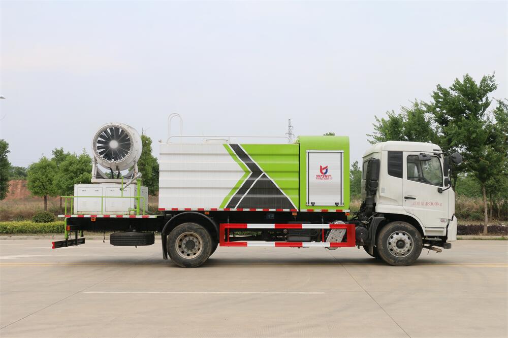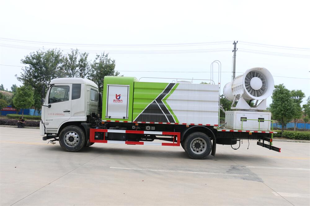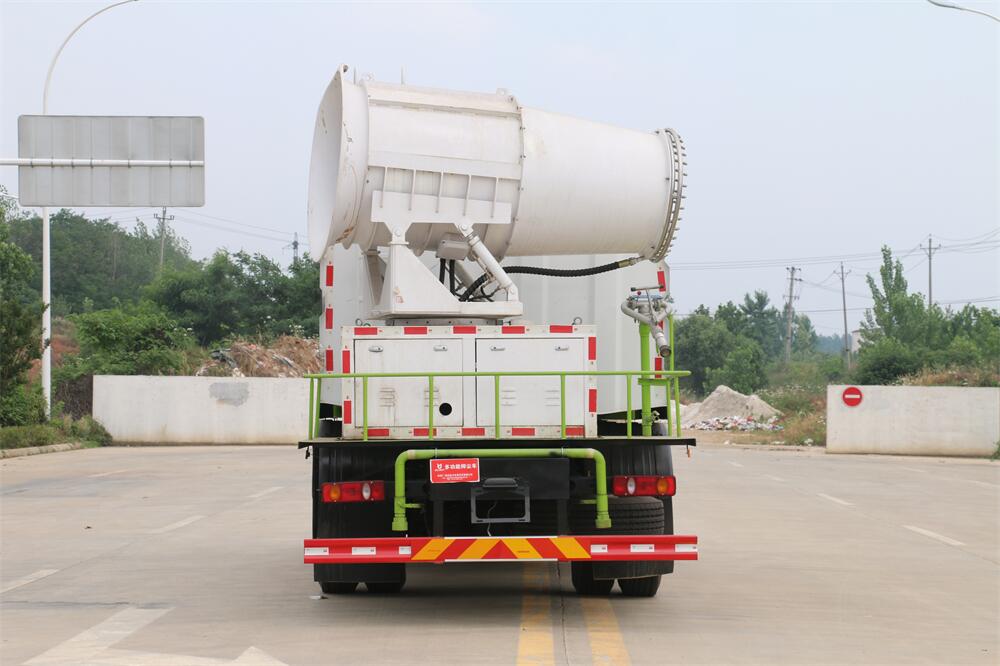 上裝配置:罐體容積為 12立方,選配風送式霧炮機組射程30米、40米、50米、60米、80米、100米、120米霧炮,罐體鋼板為4mm碳鋼Q235材質,罐內隔板具有防波作用,以減輕汽車行駛時罐體液體沖擊,罐體及整車外形尺寸按照公告。帶大功率專用灑水泵,泵可自吸自排,整車前沖、后灑、側噴、帶65消防接口,后平臺配CLW-50、CLW-60、CLW-80、CLW-100、CLW-120型風送式霧炮機組;罐體前封頭配大功率柴油發電機組;前封頭帶水位計,后平臺主管路帶1寸澆花接口,后爬梯。帶兩根輸水管及陰陽端。罐體顏色:銀/灰/綠,罐體兩側噴“多功能抑塵車”字樣,貼反光標示。
