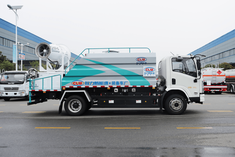 上裝配置:罐體容積為 16立方,選配風送式霧炮機組射程30米、40米、50米、60米、80米、100米、120米霧炮,罐體鋼板為4mm碳鋼Q235材質(zhì),罐內(nèi)隔板具有防波作用,以減輕汽車行駛時罐體液體沖擊,罐體及整車外形尺寸按照公告。帶大功率專用灑水泵,泵可自吸自排,整車前沖、后灑、側(cè)噴、帶65消防接口,后平臺配CLW-50、CLW-60、CLW-80、CLW-100、CLW-120型風送式霧炮機組;罐體前封頭配大功率柴油發(fā)電機組;前封頭帶水位計,后平臺主管路帶1寸澆花接口,后爬梯。帶兩根輸水管及陰陽端。罐體顏色:銀/灰/綠,罐體兩側(cè)噴“多功能抑塵車”字樣,貼反光標示。