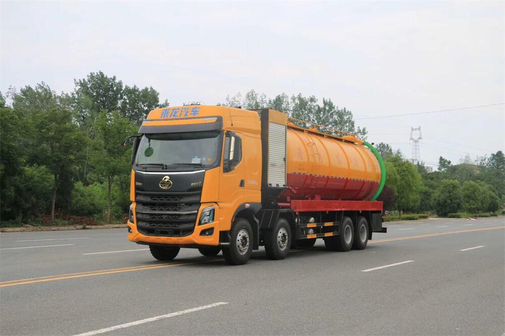 上裝配置:罐體容積為 30 立方(水污可自由 分配),罐體 8mm 厚,封頭 8mm 厚,水罐、污 罐可互通,用 100 球閥**開關;清洗部份采 用雙耀高壓泵,壓力 20Mpa,流量 330L/min, 配 80 米直徑 25 高壓管帶液壓卷盤;吸污部份 采用濰柴420馬力副發動機帶山東SK-42水循 環泵(副發自帶),吸污罐帶舉升,尾部加裝 一個 600mm 快開,罐體后尾部一個 DN150 不銹 鋼排污口,一個 DN150 不銹鋼偷排,兩個 DN100 吸污球閥帶出口盤,一個視污窗,兩根 10m 吸 污管,一套陰陽端,壓力表,防溢閥,箭頭燈, 工具箱,淋管裝置,高壓泵帶氣吹水。配一個 9 公斤水雷噴頭,另帶一個 80 公分手持洗車 噴頭。