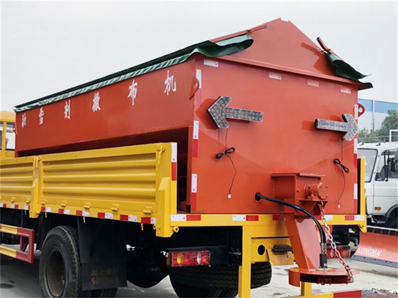 發(fā)動機帶動導(dǎo)輥旋轉(zhuǎn),把料箱中的融雪劑輸送到撒布斗,通過撒布斗的旋轉(zhuǎn)把融雪劑均勻撒布到路面。