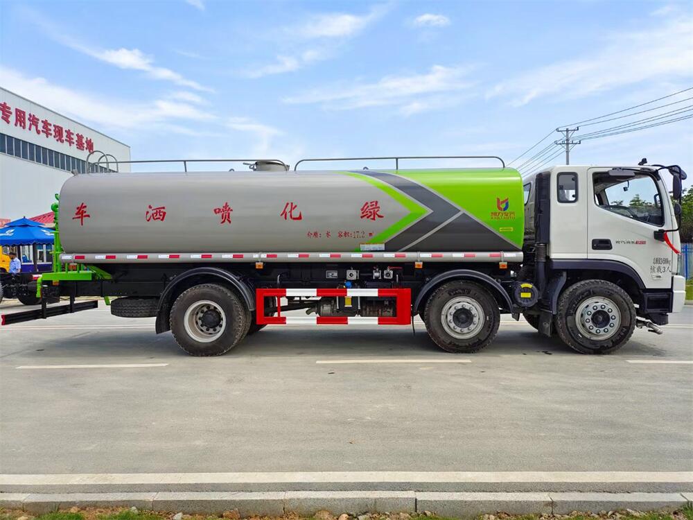 灑水車前裝有鴨形噴嘴或圓頭沖嘴,后面裝有圓柱開灑水噴嘴或蓮蓬頭噴嘴,后部有一工作平臺,裝配有水炮。后部還可裝8個噴嘴(選裝)。